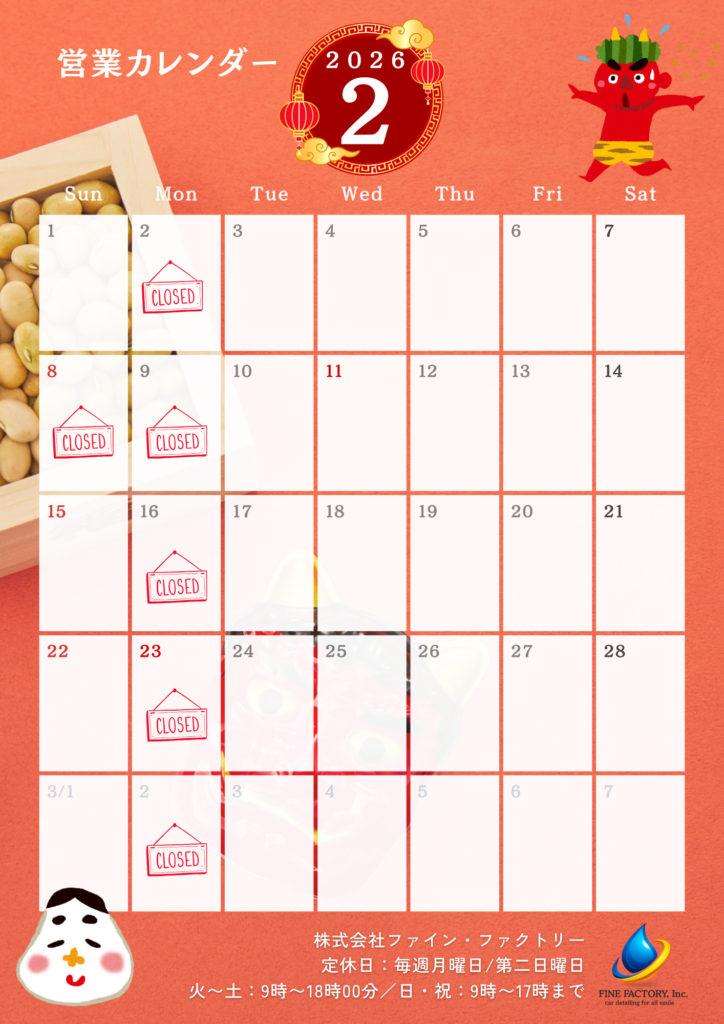 2月定休日のご案内 投稿日 2026年1月29日 著者 一弥矢野 カテゴリー お知らせ ・営業時間火〜土 9:00〜18:00日・祝 9:00〜17:00・定休日月曜・第2日曜 大切なお知らせ 定休日のお知らせ