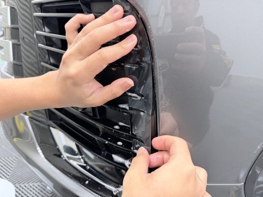 - フロントバンパー & グリル 画像でもご覧いただける通り、フィンの一本一本、センサー周りの細部に至るまで、手作業で丁寧にフィルムを入れ込んでいきます。この手間を惜しまないことで、貼ってあることが分からない自然な仕上がりになります。