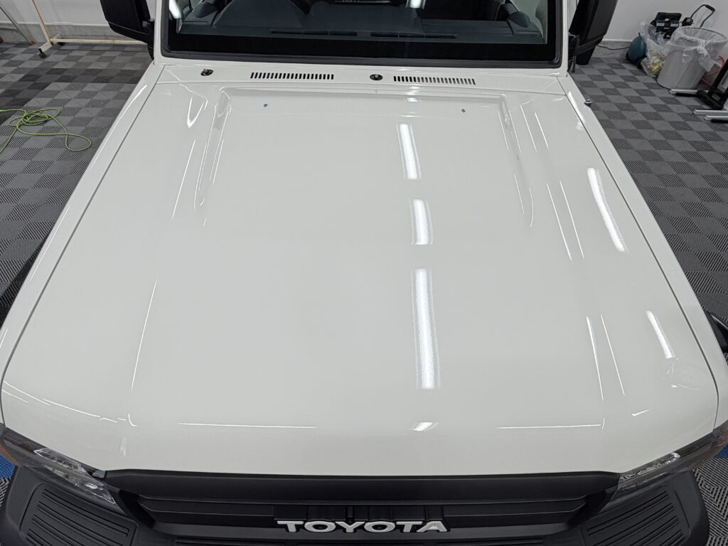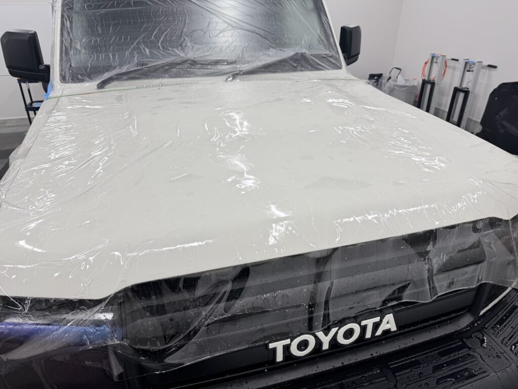 今回は、そんなランクル70の“顔”を確実に保護するため、ボンネットおよびカウルトップに「GYEON HYBRID PPF(ジーオン ハイブリッド プロテクションフィルム)」を施工させていただきました。
