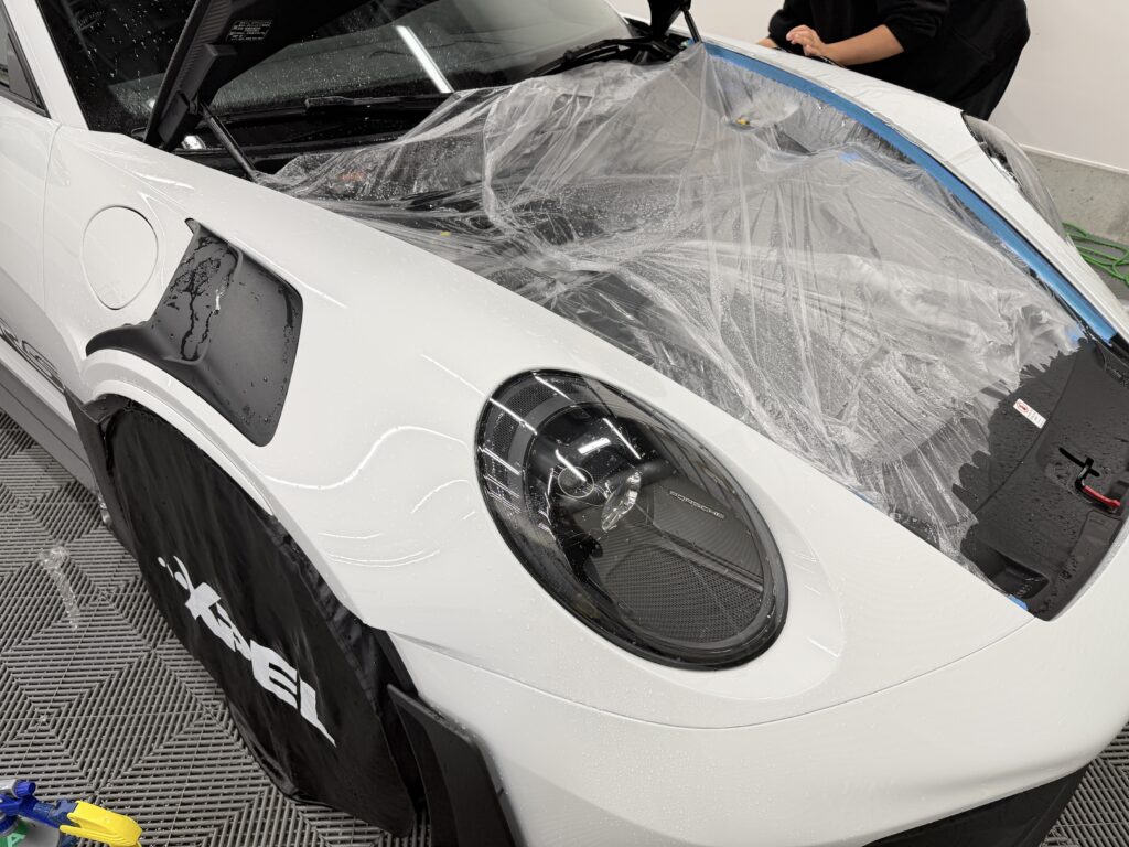 GT3 RSのような複雑なエアロダイナミクス形状を持つ車両の施工において、最も重要になるのが「フィルムカットの精度」です。