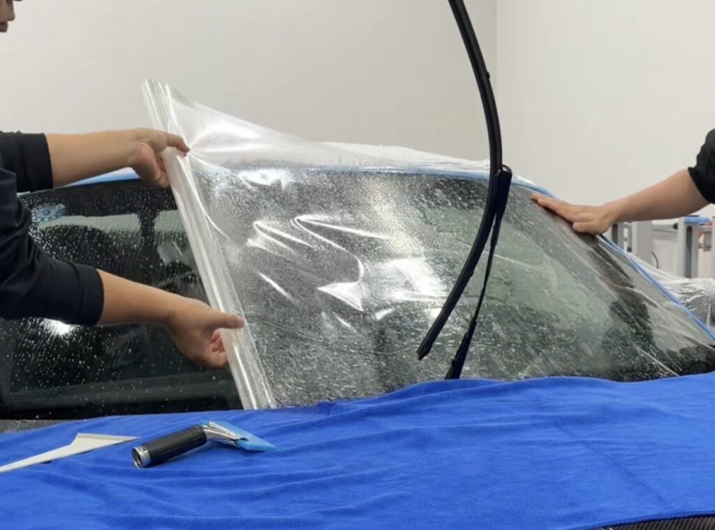 ボディだけでなく、フロントガラスの保護もハイスピードドライビングには欠かせません。 今回はボディ用フィルムと合わせ、フロントガラス専用のプロテクションフィルム「XPEL WINDSHIELD(ウィンドウシールド)」を施工しました。