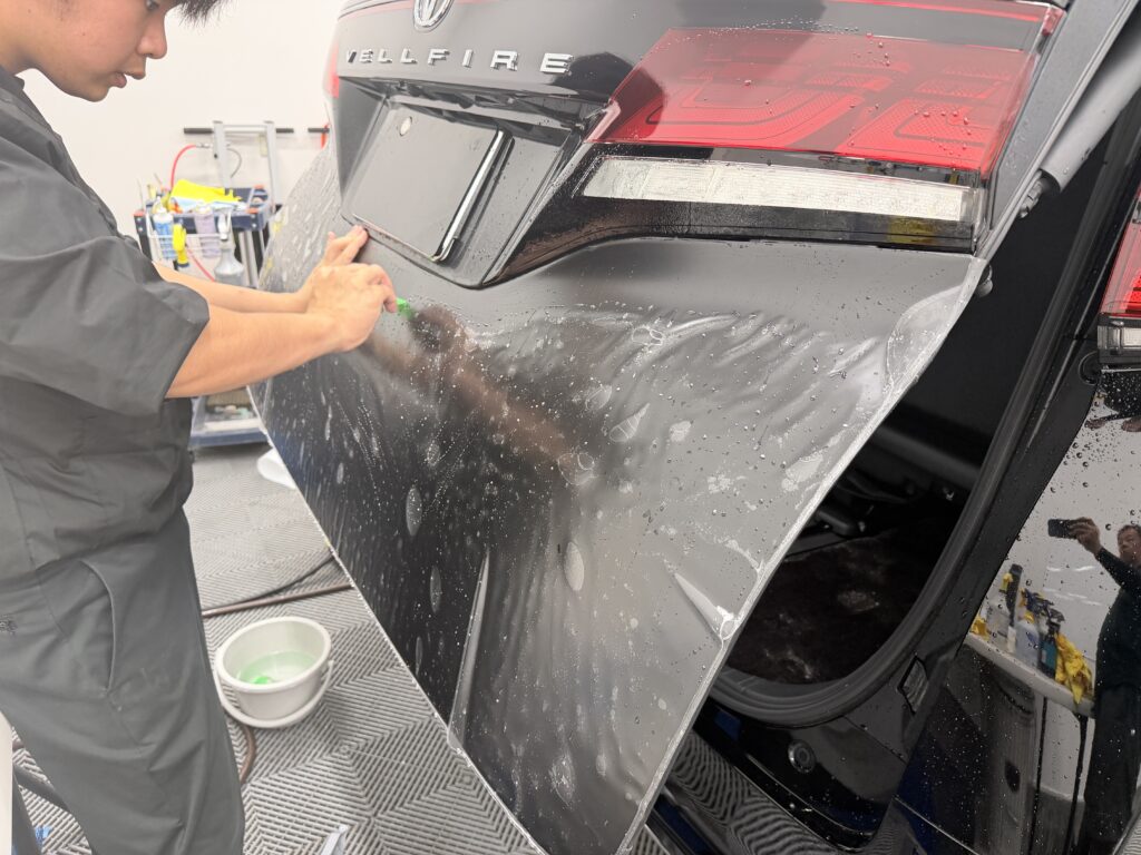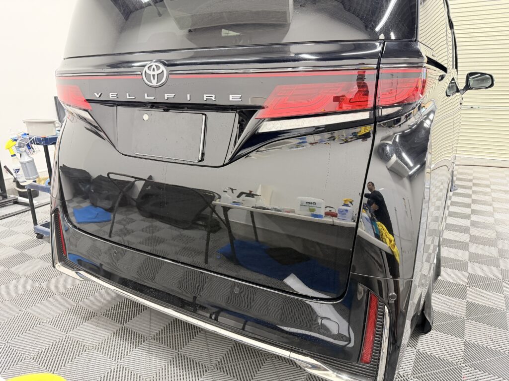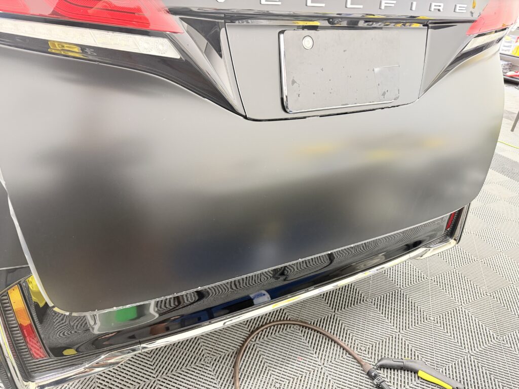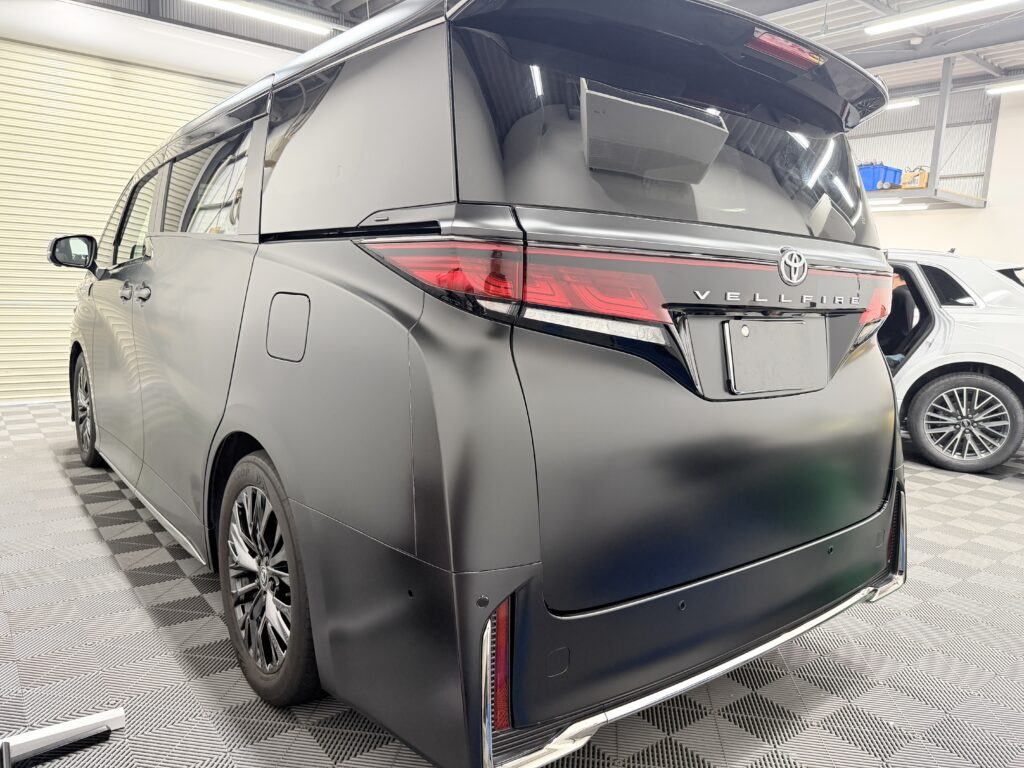 「VELLFIRE」のロゴが輝くリアハッチや、複雑な形状のリアバンパーも、マットプロテクションフィルムで完全にカバー。画像3の仕上がりを見ると、メッキパーツとのコントラストが際立ち、純正にはない「いかつさ」と上品さを兼ね備えたリアビューになっています。