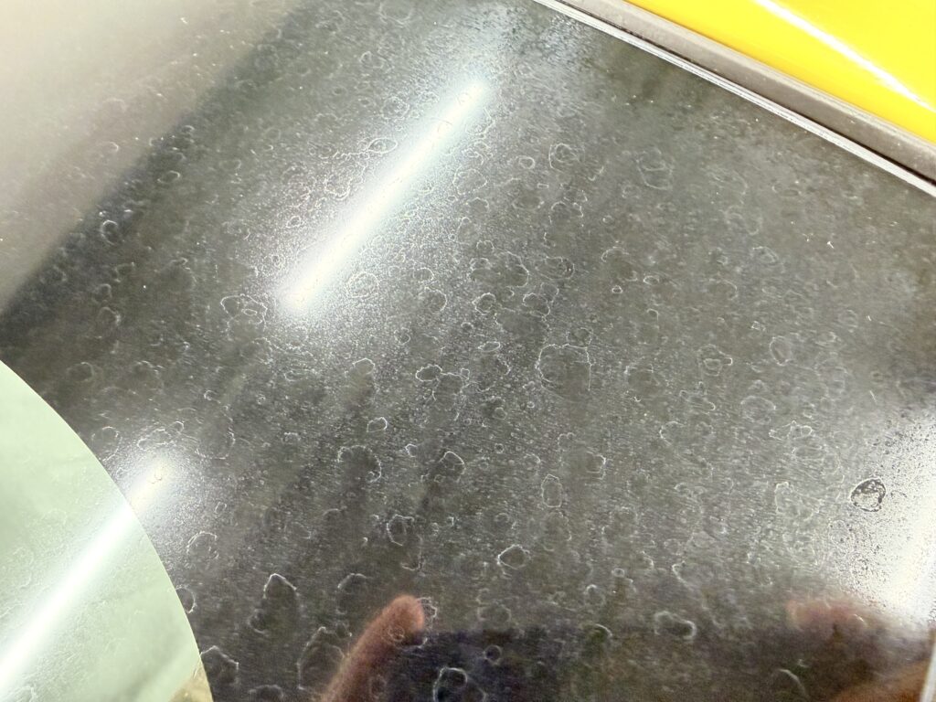 お車を拝見すると、窓ガラス全面に26年分のウロコ(水垢)がびっしりと固着しており、オーナー様ご自身も「正直、前も見えない状態」と仰るほど深刻な状態でした。