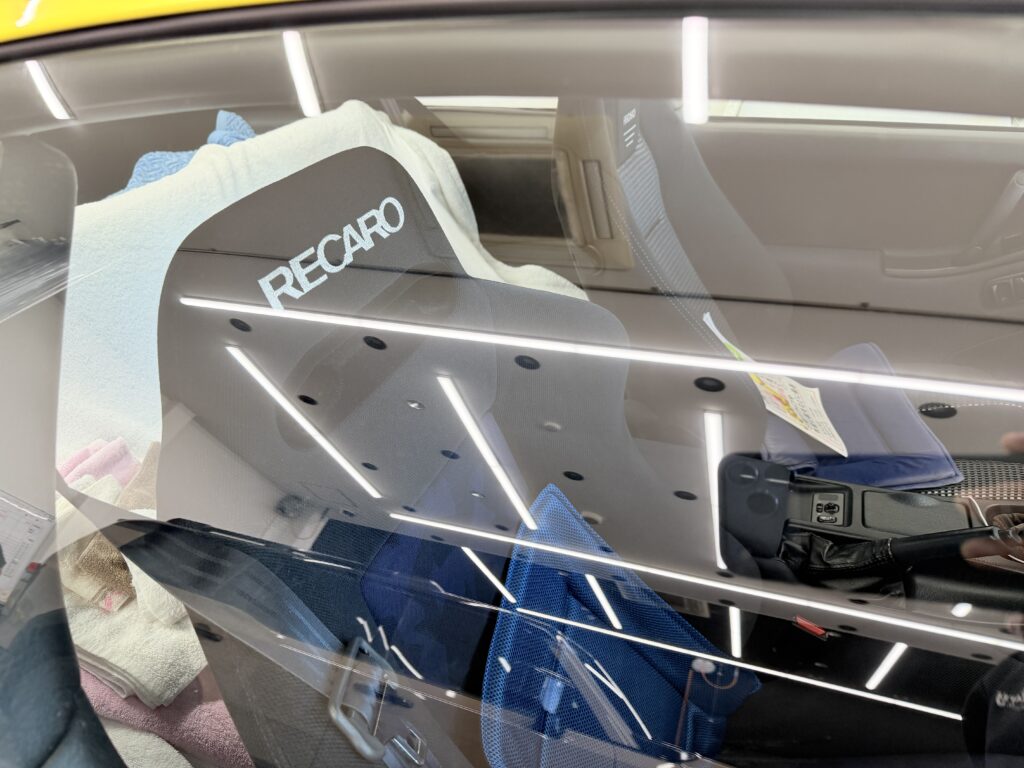 施工後の写真をご覧ください。 びっしりと付着し、白く濁っていたガラスのウロコが綺麗に除去され、向こう側の景色や車内のレカロシートがくっきりと透けて見えるほど、クリアな状態へと復元しました。