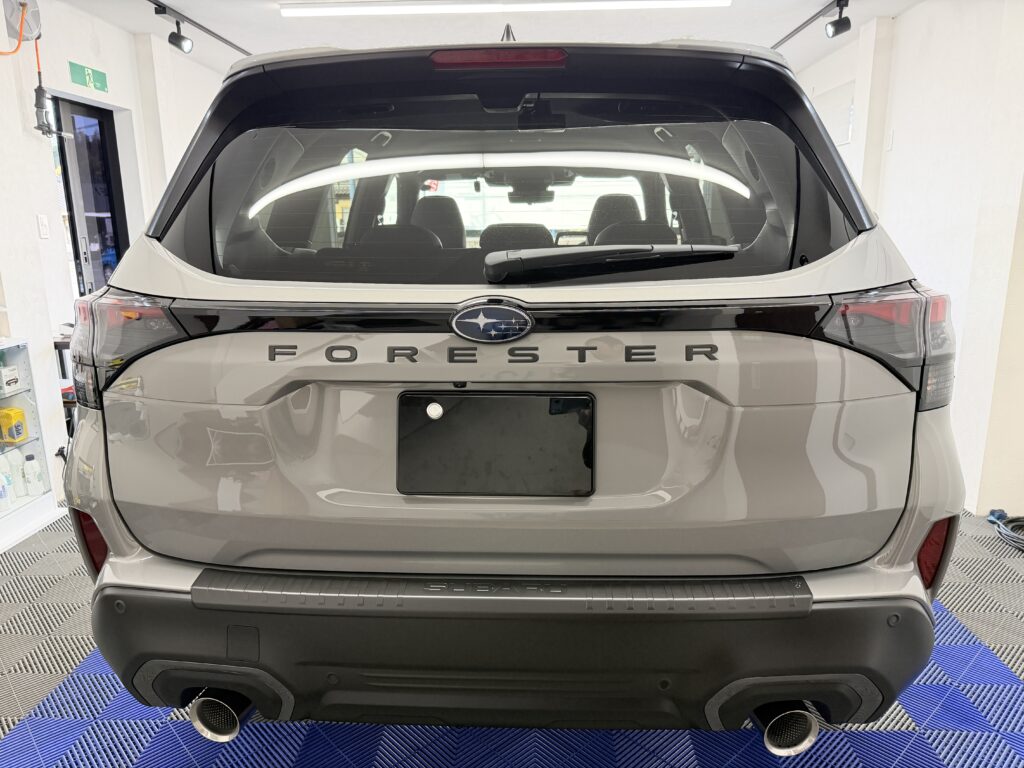 リアゲート中央の「SUBARU」エンブレムと、その下の「FORESTER」ロゴにもライトスモークフィルムを施工しています。 これにより、メッキ部分がブラッククロームのような深みのある色合いになり、リバーロックパールのボディカラーと相まって、非常に上質で都会的なカスタムに仕上がりました。 細部までこだわったこのカスタムが、他とは違う一台を演出します。