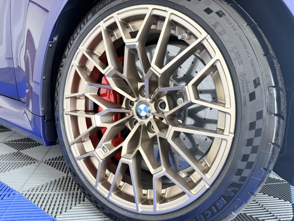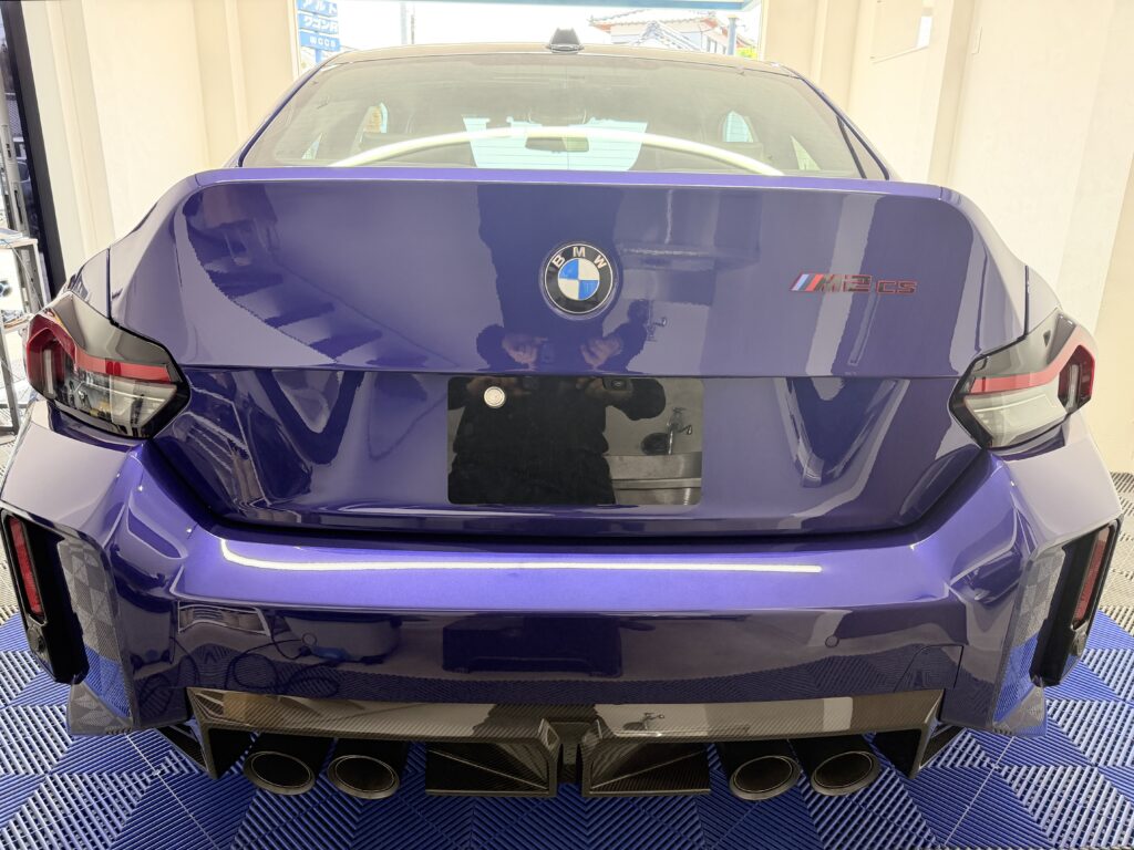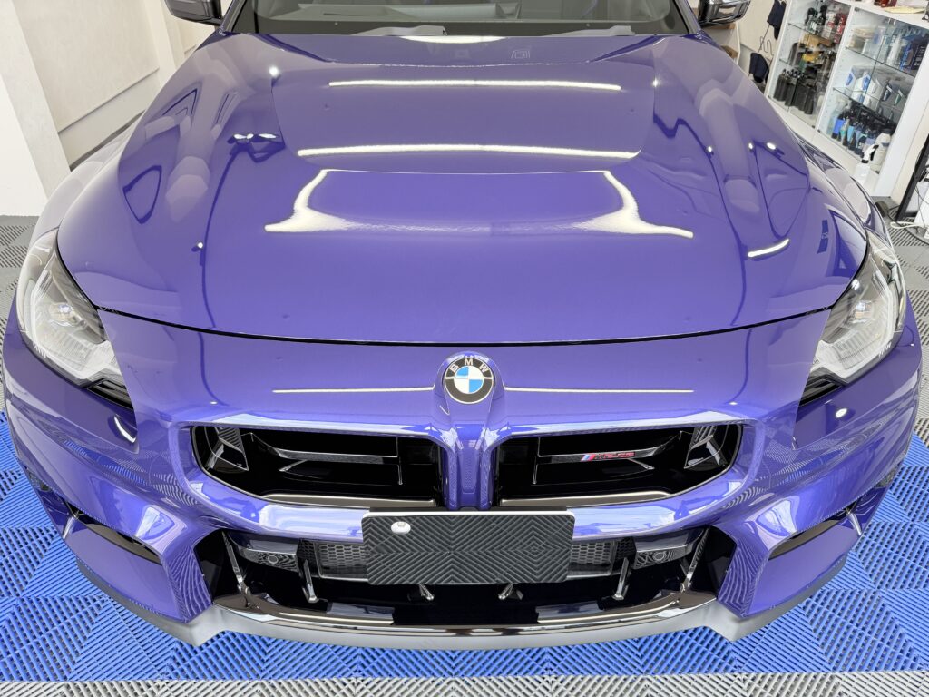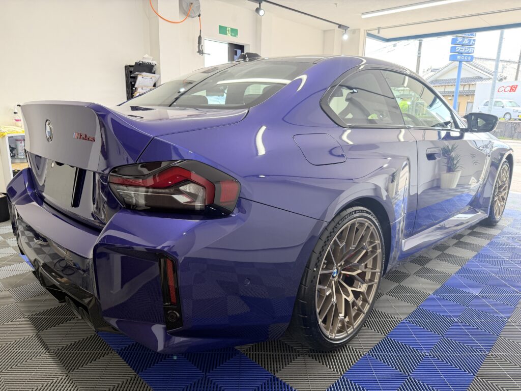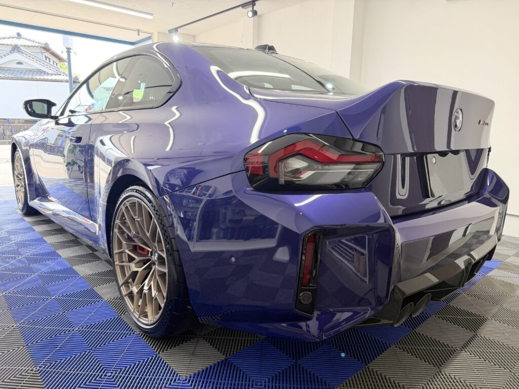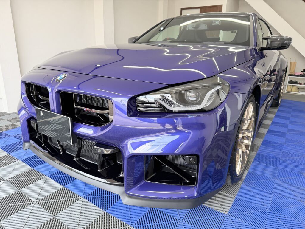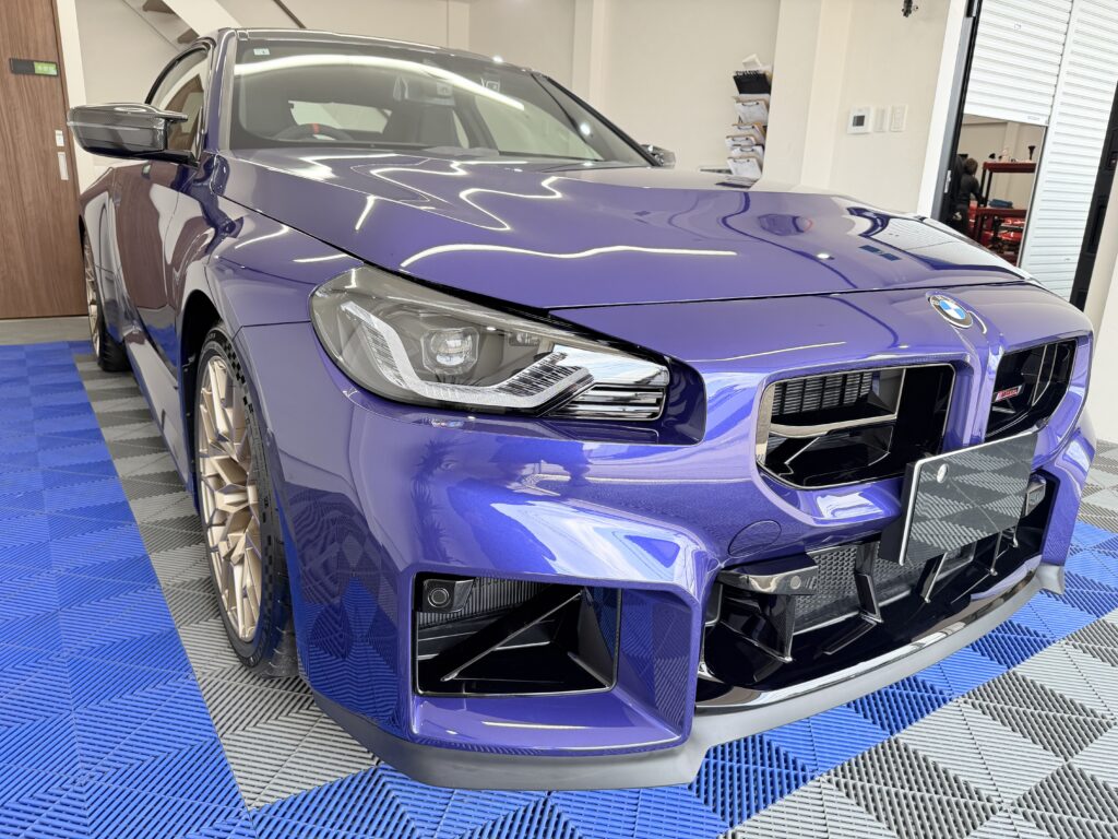 宮崎市のトータルカーケアショップ「ファインファクトリー」です。 今回は、圧倒的な存在感を放つスポーツクーペ「BMW M2 CS」の施工事例をご紹介いたします。美しいパープル系のボディカラーと、特徴的なゴールドホイールの組み合わせが目を惹く一台です。 新車の美しい状態を長く維持できるよう、外装のトータルコーティングをご依頼いただきました。