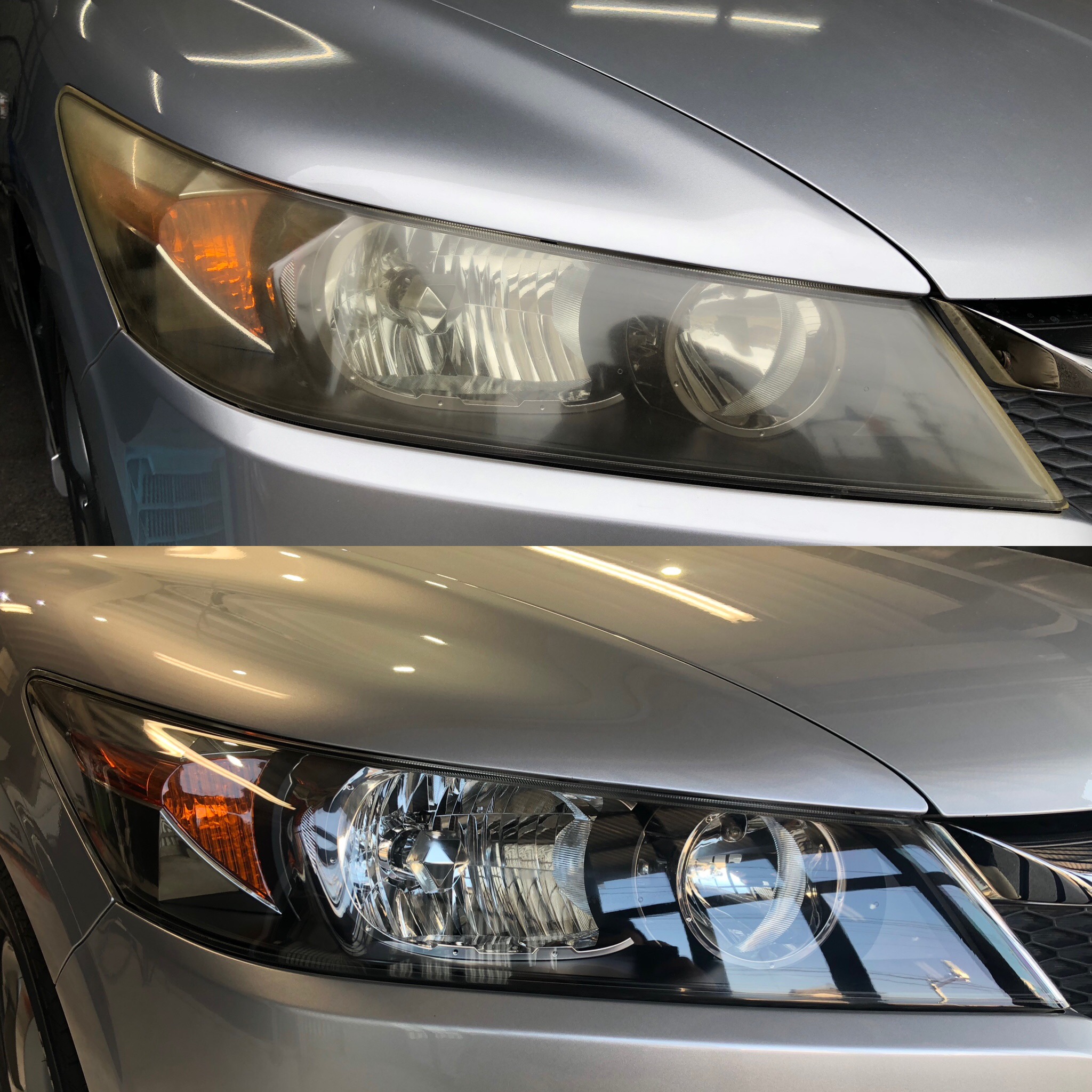 愛車の見た目は目元から、ヘッドライトの黄ばみも研磨、コーティングにより復元。