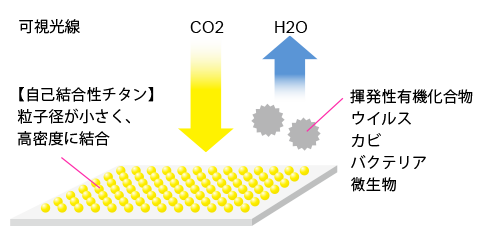 ウイルスやカビ、細菌などの有機微生物は、酸化チタン粒子表面で酸化されます。ホルムアルデヒドやトルエンなども、酸化チタン粒子表面で酸化分解されて、無害なCO2とH2Oとなります。